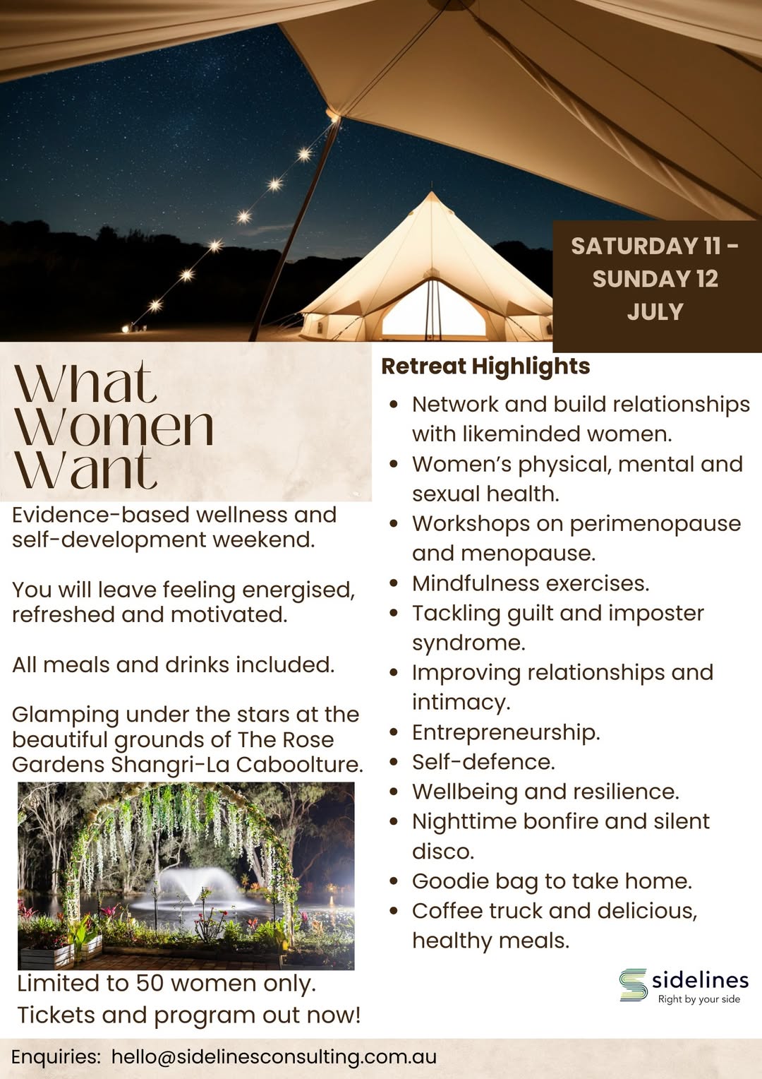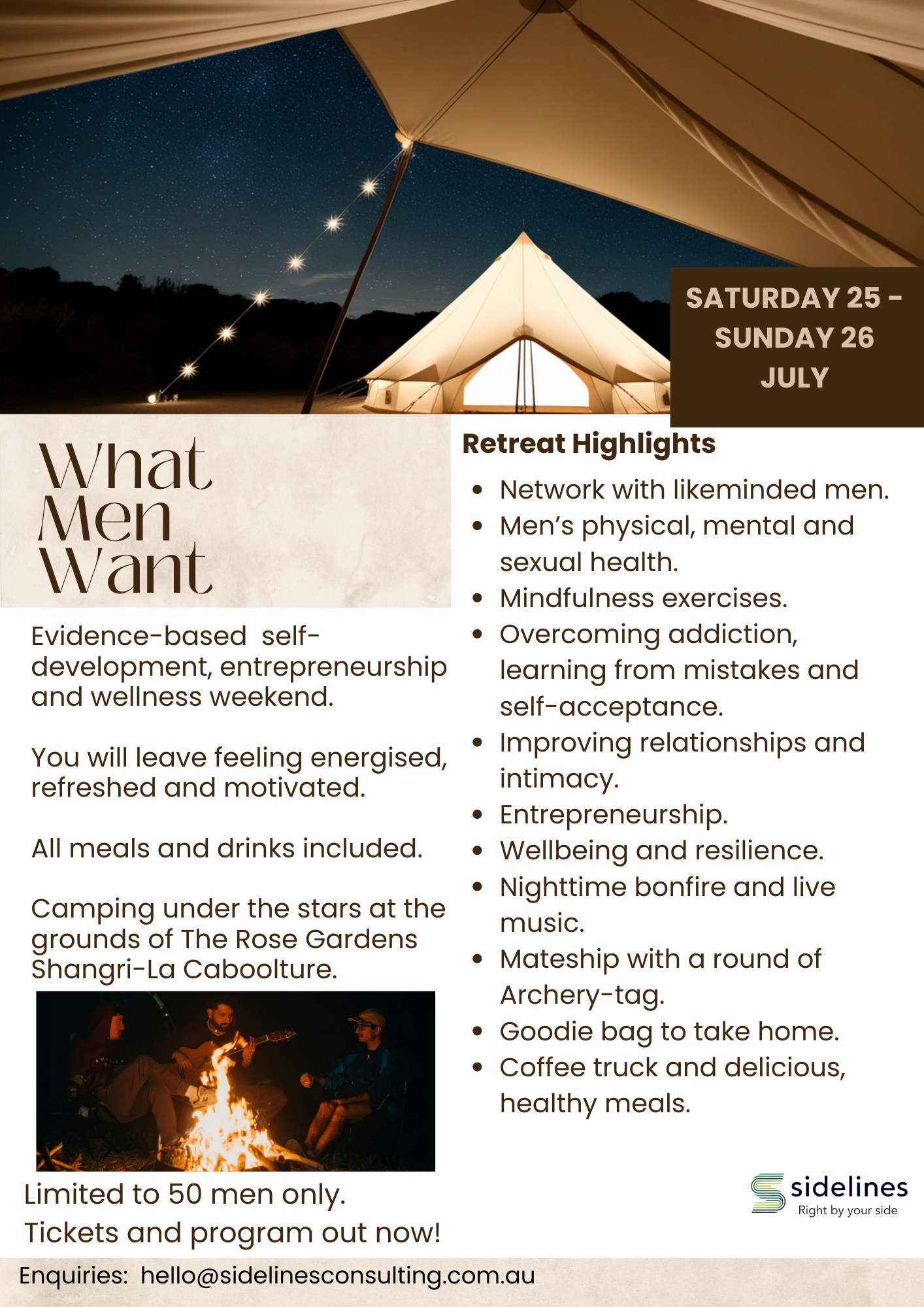 In July we have two evidence-based health and self-development retreats in Moreton Bay. One for Women and one for Men limited to 50 per event. Each event features glamping under the stars, entertainment, and exquisite catering (all meals and drinks included). These are two events that you do not want to miss.